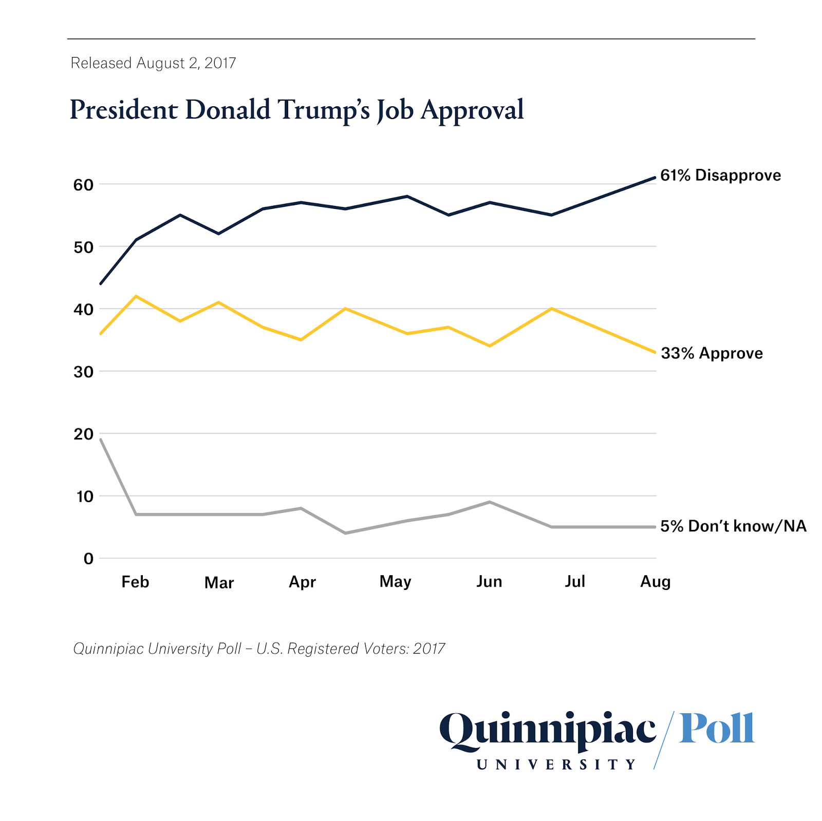 Just 33 percent of voters approved of Trump's job performance overall, a sharp decline from 40 percent approval in the Quinnipiac poll at the end of June. Sixty-one percent of voters disapproved of Trump in the latest survey.